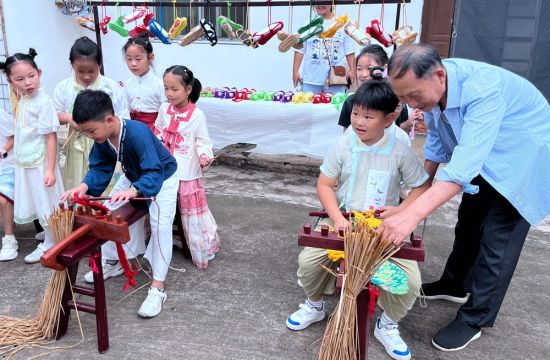 在老手艺人罗业双家中,孩子们好奇地观看一根根稻草如何在老人灵巧的双手中逐渐变成实用的生活器具,并亲手体验编织,感受传统手工艺的智慧与匠心精神。