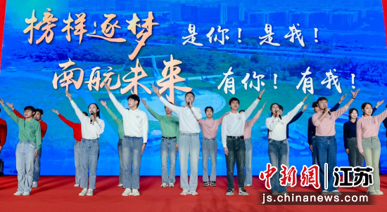 今年,全体获奖学子继续组成“榜样领航”优秀学子宣讲团,进班级、进宿舍宣讲,传递榜样力量。南京航空航天大学党委副书记刘宇雷为“榜样领航”优秀学子宣讲团授旗。(南京航空航天大学 供图)