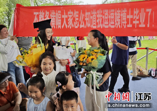 6月20日,东南大学举行博士学位授予仪式,一位博士生的亲属带着横幅前来庆祝。中新社记者 泱波 摄