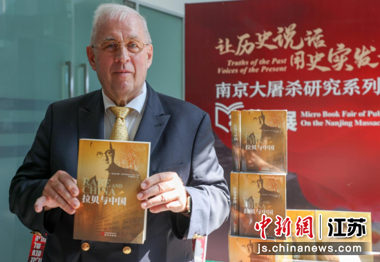 8月15日,江苏南京,约翰・拉贝的孙子托马斯・拉贝展示《拉贝与中国》一书。当天,侵华日军南京大屠杀遇难同胞纪念馆举行第四批南京大屠杀历史记忆传承人颁证仪式。中新社记者 泱波 摄