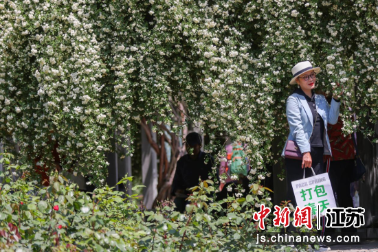 4月15日,江苏南京,玄武湖畔木香花盛放,团团簇簇从高处垂挂而下如“瀑布”,吸引市民前来拍照留影,感受春天。中新社记者 泱波 摄