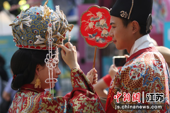5月29日,江苏南京,主题为“和合而美 喜福同好”的集体婚礼在城南老街举行,新人们身着华美服装在传统婚俗仪式中上演“中式浪漫”。中新社记者 泱波 摄
