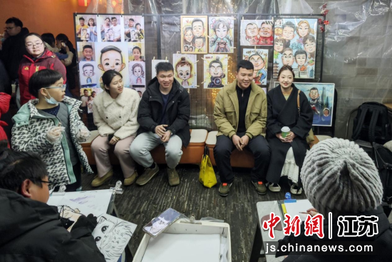 2月15日晚,江苏南京,游客们在城南老街上体验手绘肖像漫画。中新社记者 泱波 摄