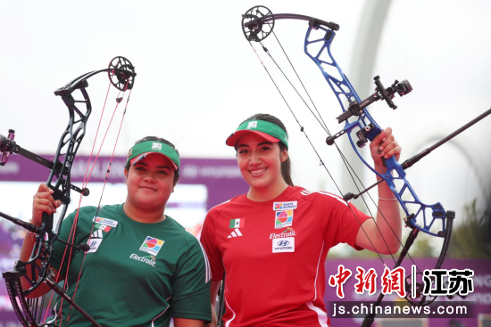 10月18日,2025射箭世界杯总决赛在南京奥林匹克博物馆广场燃情开赛。在当天上午举行的女子复合弓比赛中,墨西哥选手MARIANA BERNAL和ANDREA BECERRA分获冠亚军。中新社记者 泱波 摄