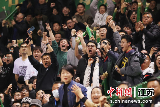 3月9日晚,在江苏南京举行的2024-2025赛季中国男子篮球职业联赛常规赛中,现场观众为比赛球队加油。中新社记者 泱波 摄