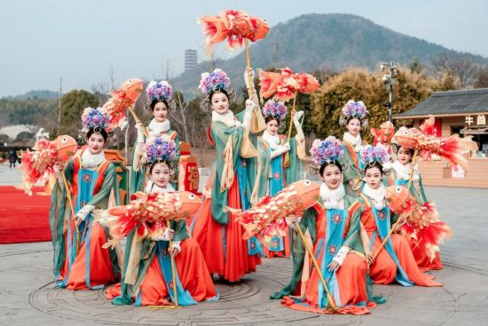 牛首山下的金陵小城年味十足,以“福潮金陵年”为主题,营造出沉浸式六朝新春幻境。白日里古巷雅致,夜晚灯火璀璨,文心馆水域灯笼摇曳,凌霄台巨型福字亮化墙点亮夜色,再现金陵的繁华盛景。非遗滚灯、火舞表演、非遗铁花秀等节目轮番登场,火龙踏焰、铁树银花绽放夜空,带来震撼的视觉盛宴。马年福字木板拓印、金陵金箔手作等体验活动,让游客近距离感受非遗技艺的魅力;古风NPC巡游穿梭于街巷之间,与市井烟火相融相生,勾勒出“昼赏禅韵,夜观灯火”的独特金陵年味。