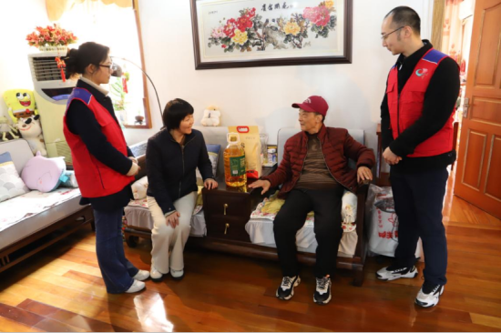 “张爷爷,我们来看您啦!最近倒春寒,您可得注意保暖啊。”志愿者们拎着大米、食用油等生活物资,叩响了独居老人张元方的家门。