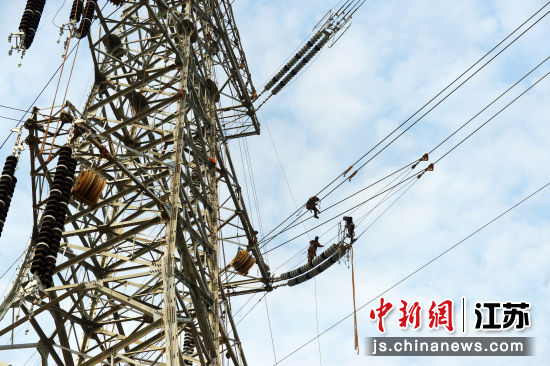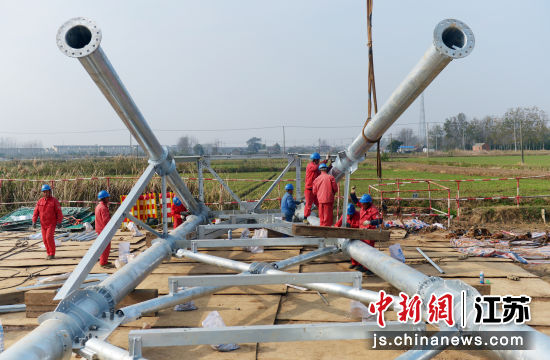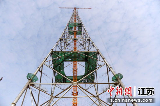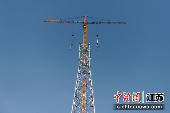 国网盐城供电公司相关负责人介绍,两座跨越塔全高约223米,是江苏境内跨淮河最高塔,单塔本体及附件重约1150吨。(顾锋明 谷华)