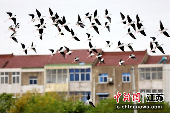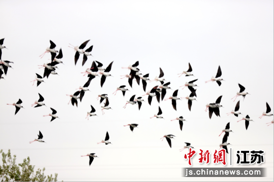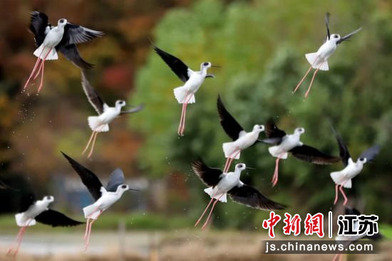 11月17日,南京高淳区桠溪街道永宁村,一处生态水塘内呈现成群黑翅长脚鹬翩飞场景。