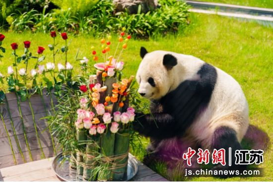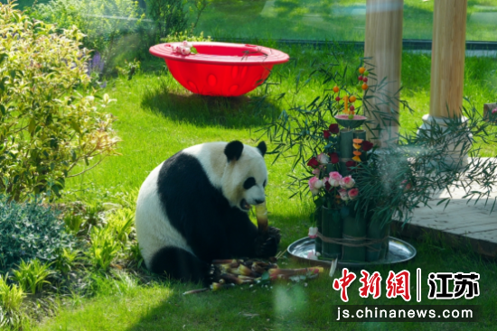 无锡动物园专为“渝宝”“加悦悦”打造江南风周年专属大餐,精心制作竹笋造型主题蛋糕,搭配多样新鲜果蔬与趣味丰容玩具,丰富其采食与游玩体验,引得现场游客纷纷驻足拍摄,定格国宝可爱瞬间。(朱浩)